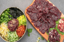 댓잎먹고 자란 소를 당일 도축하여 올린 비빔밥. 다양한 채소와 어우러진 선홍빛의 색감은 식욕을 자극한다.